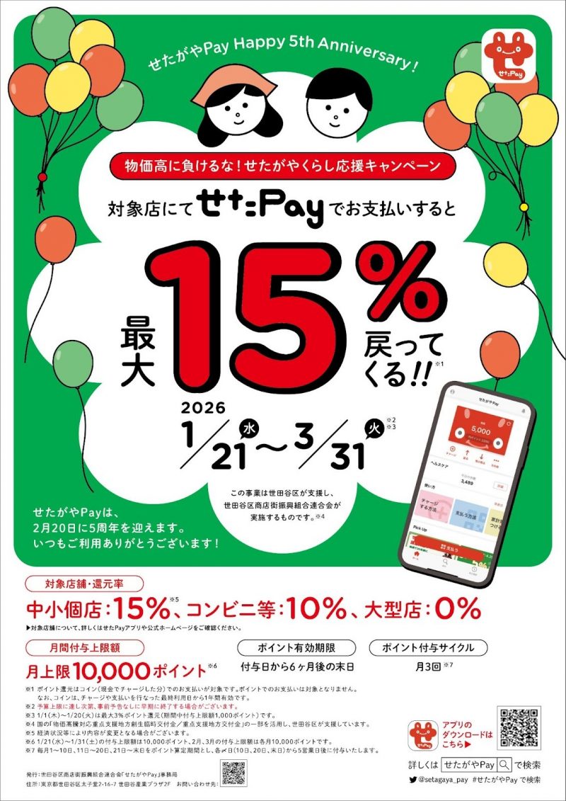 期間中に「せたがやPay」でお会計をしていただくと、 15%のポイント還元サービスが受けられます。